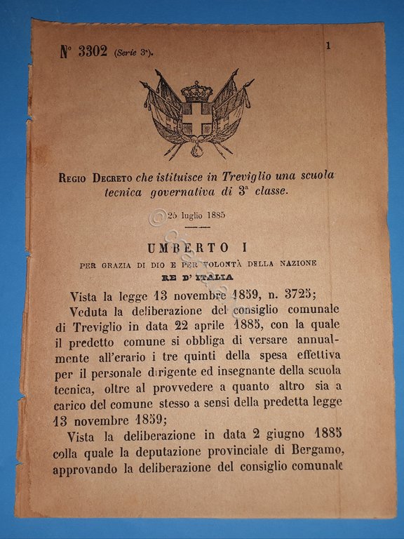 Regio Decreto che istituisce in Treviglio una scuola tecnica governativa di 3^ a classe - 1885 Decreto № 3302 25 luglio 1885 - Pagine 2 Condizioni buone come da foto