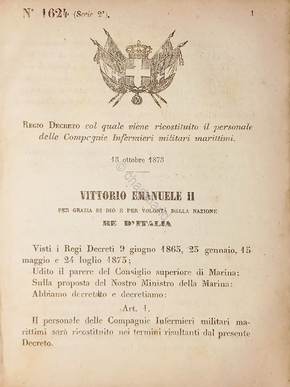 Regio Decreto col quale viene ricostituito il personale delle Compagnie Infermiere militari marittimi - 1873  Decreto № 1624  Pagine 19  Condizioni buone come da foto