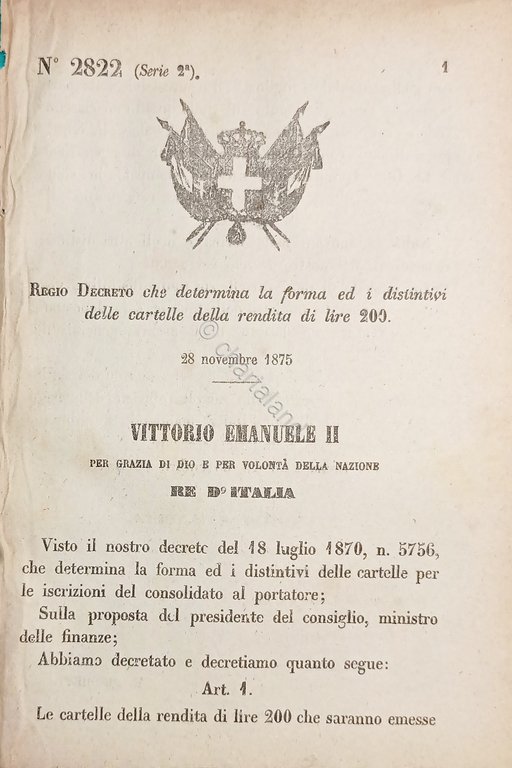 Regio Decreto che determina la forma ed i distintivi delle cartello della rendita di lire 200 - 1875 Decreto № 2822 Pagine 2 Condizioni buone come da foto