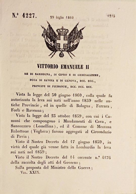 Decreto Regno Sardegna - I giovani nati nel 1839 del comune di Mezzana Rabattone e dei comuni componenti i mandamenti di Cava e Sannazzaro, ora dipendenti dal Circondario di Pavia concorreranno ancora per questa leva al sorteggio negli antichi Circondari di Voghera e Lomellina...I comuni già appartenenti al Circondario di Nizza ed ora dipendenti da quello di Cuneo saranno per fatto di Leva uniti al Mandamento di tenda... Decreto N. 4227 del 29 luglio 1860 Pag. 2 Condizioni molto buone.