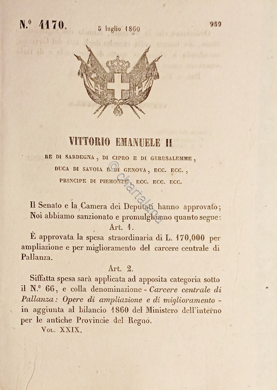 Decreto Regno di Sardegna - Approvazione spesa straordinaria per ampliamento e miglioramento del Carcere di Pallanza Decreto N. 4170 5 luglio 1860 Pagine 2 Condizioni molto buone.