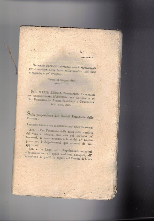 Decreto sovrano portante nuovi regolamenti per l'esenzione della tassa sulla vendita del vino al minuto e pè bevitori.