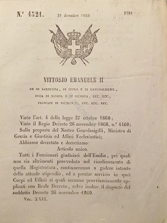 Decreto V. Emanuele II - Funzionari giudiziari dell'Emilia - 1860