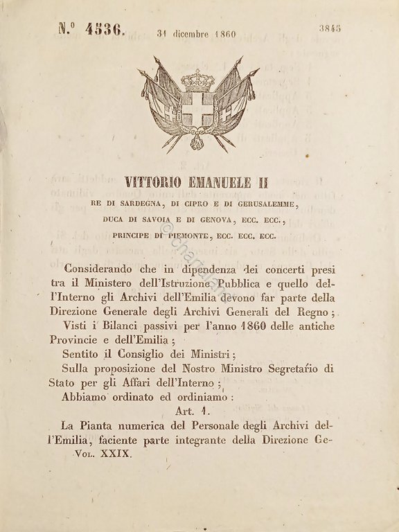 Decreto V. Emanuele II - Pianta del personale degli Archivi dell'Emilia - 1860 Decreto № 4536 Pagine 2 Condizioni buone come da foto