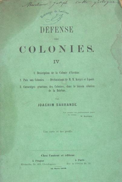 A Prague et à Paris, 1870. Petit in/4 broché, couverture imprimée, 186 pages, une carte dépliante en couleur in fine. Tache de graisse décroissante sur les deux premiers et derniers feuillets. Note manuscrite sur la couverture Joseph Coste géologue.Description de la colonie d’Archiac, paix aux colonies, déclarations de M. Frejei et Lipold, caractères généraux des colonies, dans le bassin silurien de la Bohême.