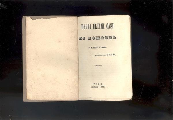 IN 16°, pp.4,100 + XXVI+1 c.b .COPERTINA MUTA IN BROSSURA MODERNA.PRENDENDO SPUNTO DAL CONTINUO FALLIMENTO DEI RIPETUTI TENTATIVI COSPIRATIVI,FINIVA PER QUALIFICARE TALE METODO COME ASSOLUTAMENTE DANNOSO ALLA CAUSA ITALIANA. L'INDIPENDENZA E LA FINE DELLA DOMINAZIONE STRANIERA SAREBBERO STATE RAGGIUNTE INVECE QUANDO SI FOSSE COSTITUITA UN'OPINIONE PUBBLICA NAZIONALE IN GRADO DI CONDANNARE GLI ABUSI E LE INGIUSTIZIE MESSE IN ESSERE DAI VARI GOVERNI DELLA PENISOLA. MASSIMO D'AZEGLIO (1798-1866) ,PIEMONTESE E NOBILE,FIGLIO DI CESARE, DIRETTORE DELL'AMICO D'ITALIA, FRATELLO DI UN NOTO GESUITA, NEL GENNAIO DEL 1846 PUBBLICA IL PRESENTE SCRITTO DOVE TRA LE ALTRE, ELOGIA IL CARDINALE PASQUALE GIZZI LEGATO PONTIFICIO A FORLI' ( n° 4712 DEL NOSTRO CATALOGO ) PRIMA EDIZIONE, PARENTI pg.43, RARO LIBRETTO SUL LIBERALISMO. OTTIMA CONSERVAZIONE.<BR> ID 374