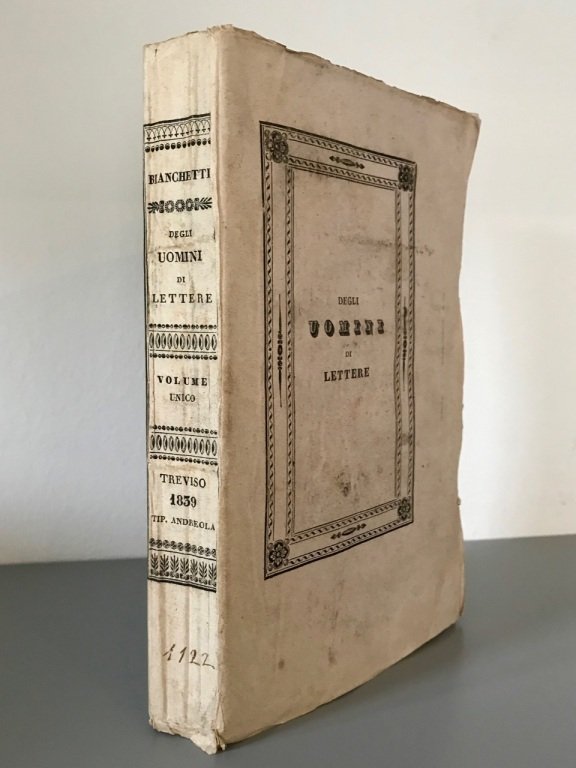 In-8° (cm. 20), brossura editoriale a stampa (leggerissime tracce d'uso), pp. 433 [3] in ottimo stato e in barbe. Prima edizione del testo del critico e scrittore trevigiano, direttore della Biblioteca Comunale di Treviso dal 1856 al 1862. Ottimo esemplare. (NG6)
