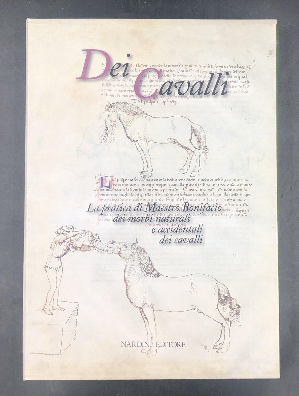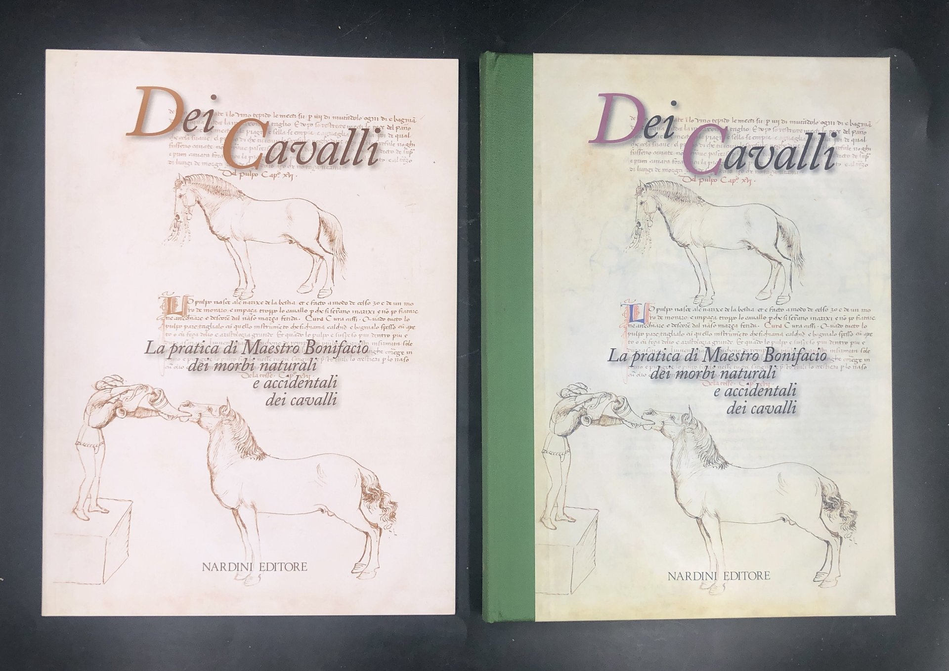 2 volumi in-4° (cm. 33x24), un vol. in fine mezza tela verde e oro, pia5tti in cartone edit. illustrato, pp. 110 totamente ILLUSTRATI riproducenti tutte le pagine del codice quattrocentesco manoscritto della Biblioteca Estense con le decine di stupefacenti FIGURE di CAVALLI, utensili; l'altro volume in brossura edit. illustrata, pp. 38, con la trascrizione a stampa del solo testo dell'antico manoscritto di Maestro BONIFACIO, maniscalco, veterinario e chirurgo della prima metà del XV secolo, di grande significato storico-scientifico.