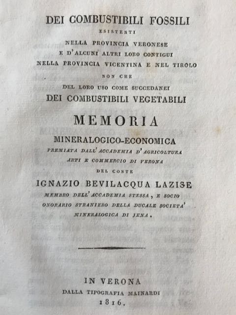 Dei combustibili fossili nella Provincia veronese e d'alcuni altri loro contigui nella Provincia vicentina e nel Tirolo non che del loro uso come succedanei dei combustibili vegetabili. Memoria mineralogico-economica.