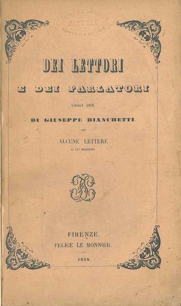 Dei lettori e dei parlatori. Saggi due di Giuseppe Bianchetti. Alcune lettere di lui medesimo Nuova edizione riveduta dall'autore
