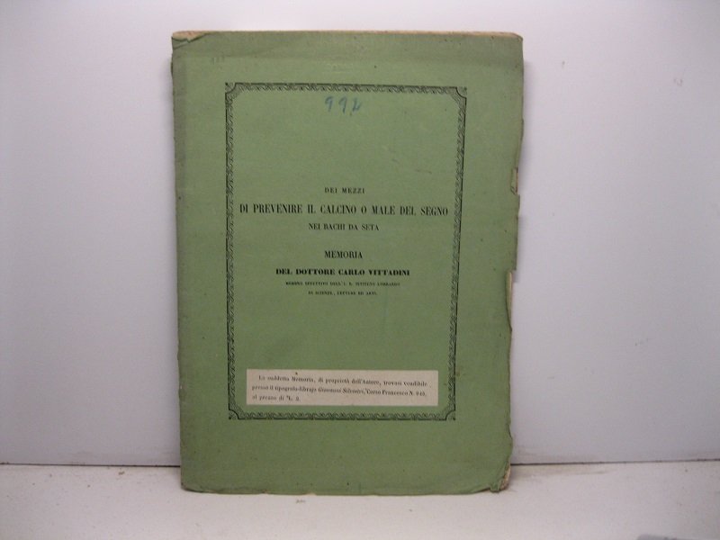 In 4, pp. 50 con una tav. f.t. Forellini di tarlo alle cc. piu' insistenti e di maggior diametro alle ultime 7 cc. Br. ed. Estratto dal Giornale dell'I. R. Istituto Lombardo di scienze, lettere ed arti. Tomo IV della Nuova Serie. Saggio usi metodi di prevenzione del calcino, malattia che si origina nel baco da seta per la resenza di una muffa denominata botrite bassiana.