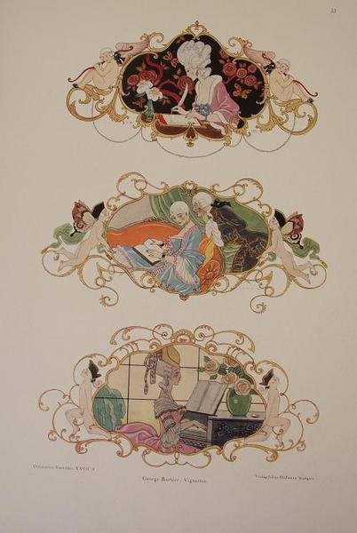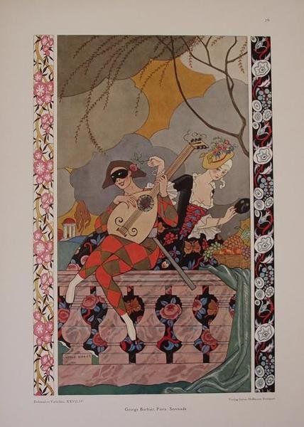 Cartella di cm. 35, pp. (12) di testo esplicativo + 80 splendide tavole a colori a fogli sciolti entro cartella editoriale in tela rossa. Perfetto stato di conservazione. Rara annata di questa rivista d'arte decorativa pubblicata in anni mitici per lo sviluppo artistico europeo ed illustrata da grandi nomi del tempo (es. George Barbier).