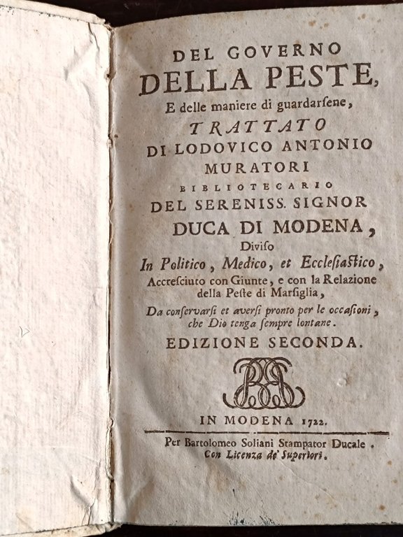<span style="font-style: normal;">In-8° (cm. 17,1), legatura coeva in piena pergamena muta (tracce d'usura al dorso), tagli spruzzati in blu; pp. XXXVI 403 [1b] in stato molto buono (lievi fioriture sparse, strappo all'angolo della sola c. A5&nbsp;con minimo fastidio al testo). Quarta edizione, con menzione fittizia di seconda edizione (la prima con l'aggiunta della </span><i>Relazione della peste di Marsiglia</i>), di questo importante trattato muratoriano sulla peste, richiamato anche dal Manzoni, a proposito degli untori e dei dubbi di Federico Borromeo intorno ad essi, nel cap. XXXII dei Promessi Sposi e nel cap. VII della Storia della Colonna Infame. Esemplare molto buono. (NO9)