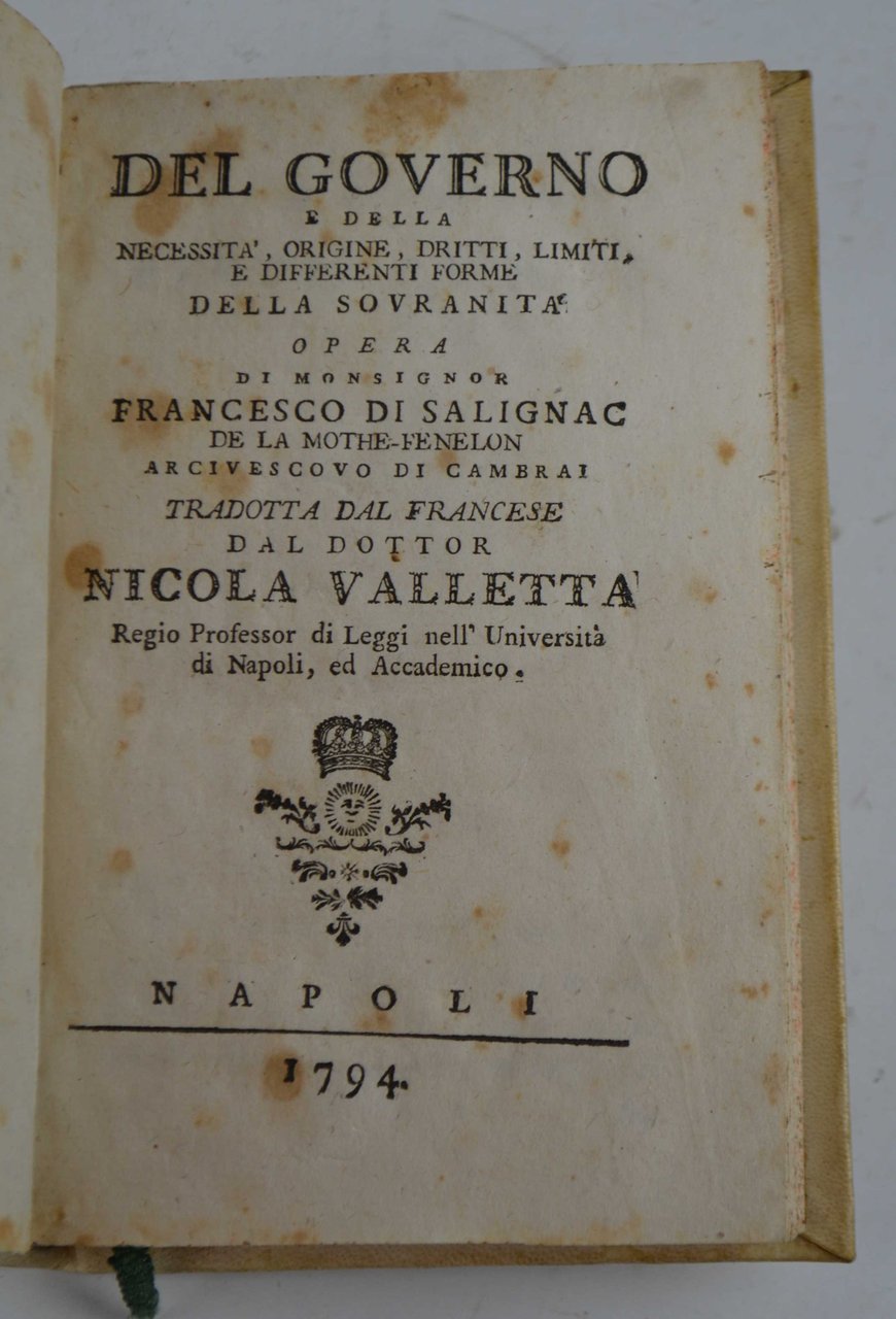 Del governo e della necessità, origine, diritti, limiti, e differenti forme della sovranità. Opera… tradotta dal francese dal dottor Nicola Valletta…