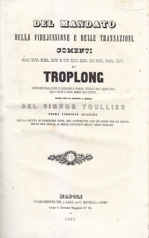 DEL MANDATO DELLA FIDEJUSSIONE E TRANSAZIONI Troplong 1846 Libro Diritto Antico