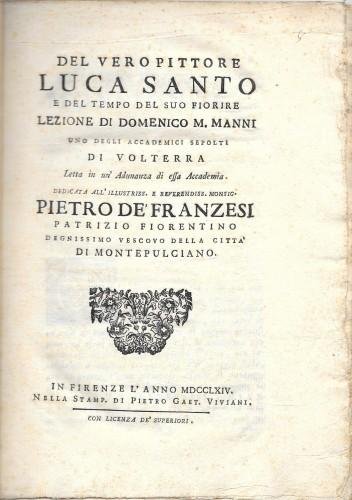 in 4°, pp. 24, 2 nn., cartone rustico con rinforzo al ds., vignetta al front. e 2 bei capil. abitati. Lezione di Domenico M. Manni uno degli accademici sepolti di Volterra, Letta in un'Adunanza di essa Accademia. Dedicata all'illustriss. e reverendiss. Monsig. Pietro de' Franzesi patrizio fiorentino degnissimo vescovo della città di Montepulciano. Carta forte. 110/32 BIS