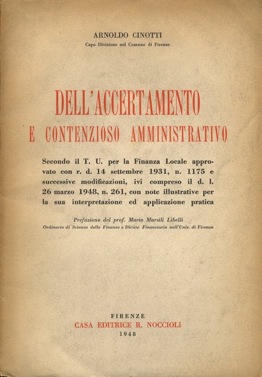 Dell'Accertamento e contenzioso amministrativo. Secondo il T.U. per la Finanza Locale approvato con r.d. 14 settembre 1931, n. 1175 e successive modificazioni, ivi compreso il d.l. 26 marzo 1948, n. 261, con note illustrative per la sua interpretazione ed applicazione pratica. Prefazione del prof. Mario Marsili Libelli.
