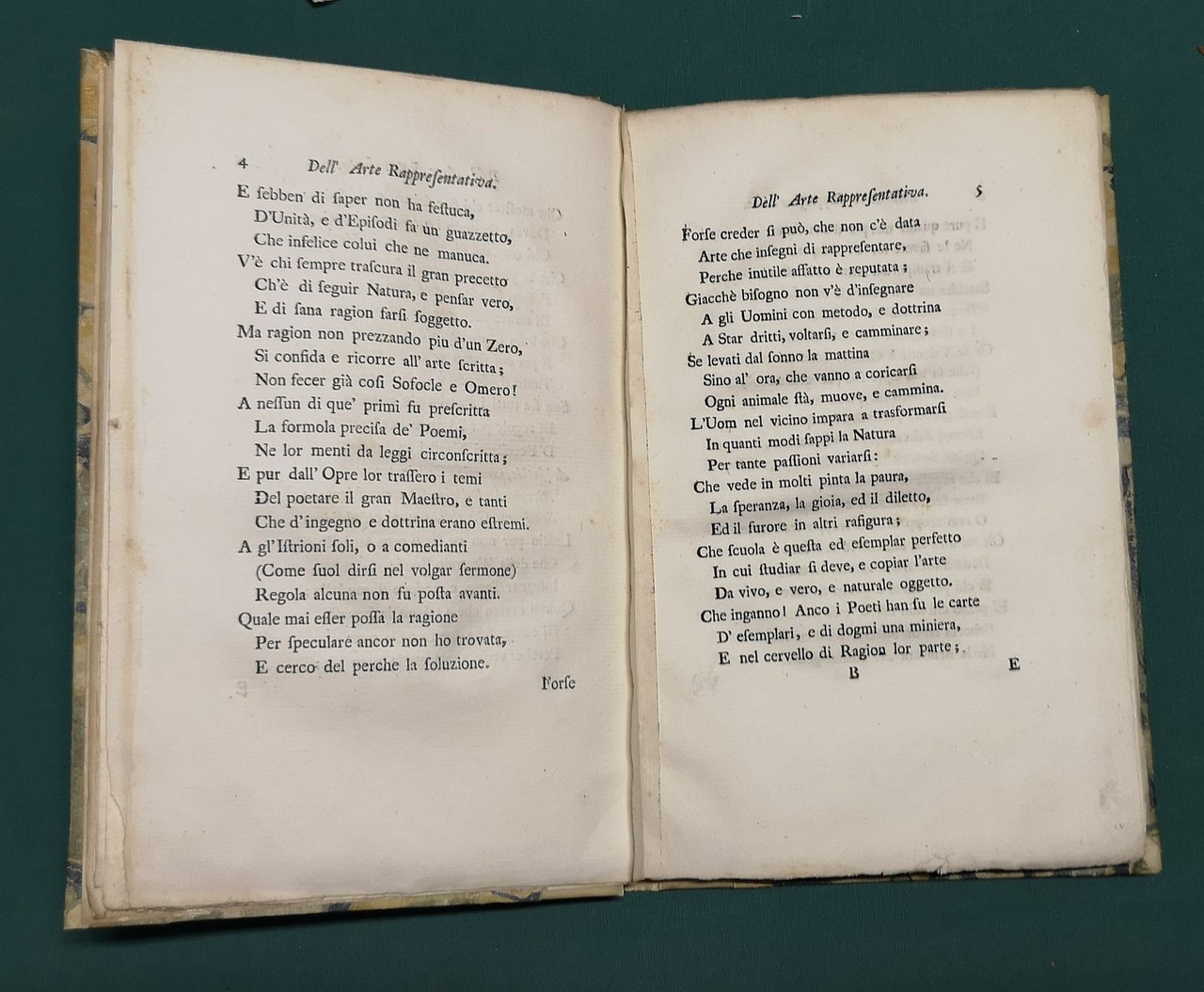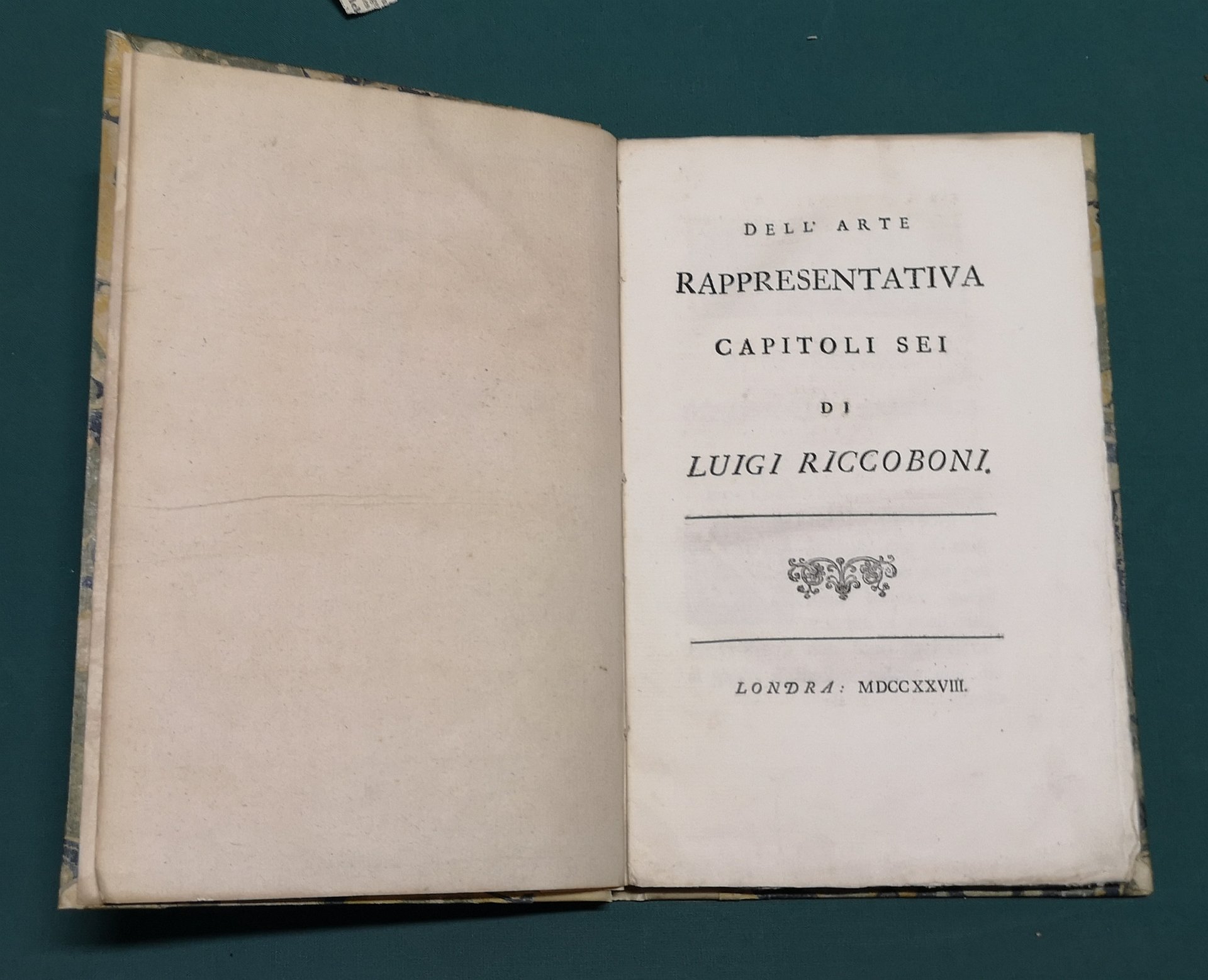 >in-8, pp. VI, (6), 60, capilettera istoriati e testatine; legatura moderna m. pergamena. Composto in terza rima e "diviso in sei capitoli, i quali insegnano a' comici tutte le finezze dell'arte loro in uno stile senza elevatezza ma naturale, ed atto più ad istruire, che a dilettare" (Bartoli, Comici Ital.) il poema, dedicato a Lord Chesterfield, viene fatto stampare dall'autore subito dopo il suo trasferimento a Londra. Prima edizione di quest'importante opera di Luigi Riccoboni, dello stesso anno della ''Histoire du Théatre Italien'' (Paris, 1728; seconda ediz. 1731, 2 vol.). Luigi Riccoboni (Modena 1675- Parigi 1753), in arte Lelio Comico, discendente da un'antica famiglia di comici italiani e ben presto celebre sia in Italia che in Francia "si è dato non solo ad ingentilire il costume pur troppo villano degli Istrioni ed a rendere l'antico decoro della carica professionale, ma, recitando regolate e poche tragedie, le rappresentò anche con vivacità e con fermezza conveniente ai soggetti...dargli il giusto titolo di vero Riformatore de' recitamenti italiani". Rarissimo esemplare, a pieni margini, dell'edizione originale. NUC, vol.492, p.413. De Courville, Bibliogr. de L.R., n. 75. Encicl. Spettacolo VIII, 942. Manca a Brunet, Gamba e Graesse.