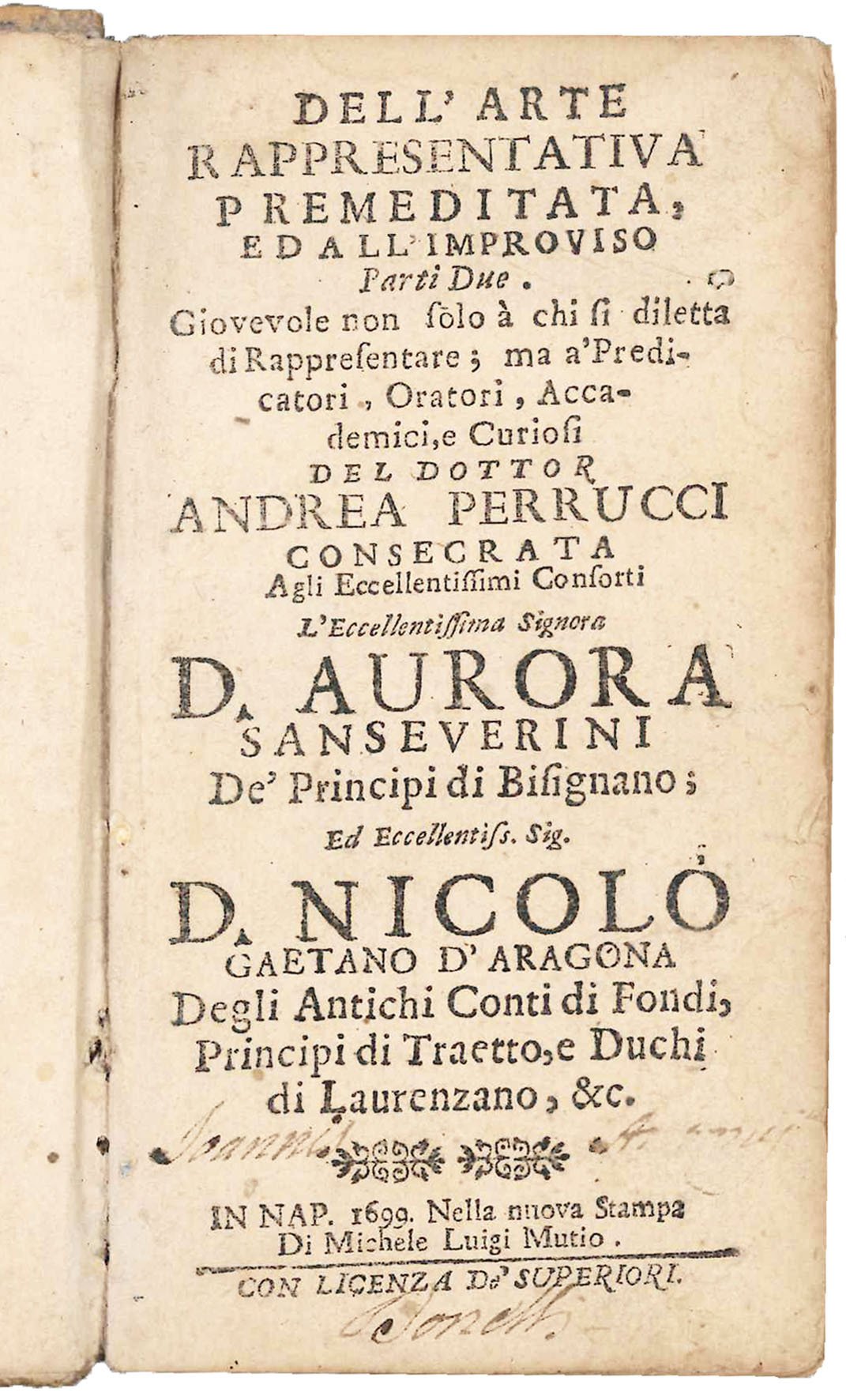 Extremely rare first edition. “Andrea Perrucci's Dell'arte rappresentativa premeditata ed all'improviso brings together the two great acting traditions of the early modern period: that of the scripted theatre and that of the commedia dell'arte. The work can be regarded as the culmination of a series of treatises on acting […] by literary men and/or by professional actors and directors of acting companies. Leone de' Sommi was the first, with an unpublished manuscript treatise dating from the 1560s. Next came Angelo Ingegneri (1598), Jules Cesar Boulenger (1603), (1609), and Pier Maria Cecchini (1628). Perrucci (1699) outdoes them all, offering detailed observations on staging, vocal ability and training, requisite acting skills, linguistic differentiation according to social status, and the manner in which distinctive roles should be played […] The evolution of Perrucci's dramatic theories, whether relative to the commedia premeditata or the improvised comedy, cannot be separated from the influence of the Spanish presence, culturally and linguistically, on the Italian peninsula during the sixteenth and seventeenth centuries. The Spanish control of all of southern Italy through the Viceregal court at Naples, and of the rest of the peninsula through dynastic marriages, left its most indelible mark on the evolution of the Italian theatre, on both scripted plays and the commedia dell'arte. On invitation from the Viceroys for both personal enjoyment and as part of the Spanish Crown's propaganda of acculturation, Spanish acting troupes, bringing with them the latest successes of Lope de Vega and his followers, inundated Naples, moving from there to ambassadorial courts throughout the peninsula. The recitation of Spanish comedies in public theatres, private homes, and religious collegi garnered captive audiences throughout the seventeenth century and well into the next century. As for dramatists, opera librettists, and the comici dell'arte, the translation or adaptation of Spanish pieces offered immediate financial and professional rewards. Andrea Perrucci was no stranger to this literary phenomenon, having been born (1651) at a time when the imitation of things Spanish was in full flower. Perrucci's presence in Naples coincided with the reign of Philip IV (1621-1665), fervent supporter of Spain's theatre at home and abroad, and that of Charles II (1665-1700), whose successive Viceroys continued to promote Spanish culture, the theatre being its most prominent medium. Andrea Perrucci undoubtedly had contact with Spanish actors and with Italian dramatists, librettists, and players (comici) who had adapted Spanish works for the Italian stage. Unlike many of his peers, Perrucci did not write in Spanish. But he was familiar enough with that language to read in the original Lope de Vega's Arte nuevo de hacer comedias en este tiempo, published roughly one hundred years earlier, its earliest states dating from around 1605. Perrucci's multiple allusions to that text in his treatise speak to the continuing influence of the Spaniard's dramaturgy in Italian acting circles. Lope de Vega's twenty-page tract, in verse, offered Perrucci concrete advice as to the types of plots that are most enjoyable; the preeminent need to please the public even though the classic rules of the art be compromised; the dramatic intrigue of gender-reversing disguises, given that men and women were routinely cast in their own genders at that time; the need to maintain decorum in speech and manner according