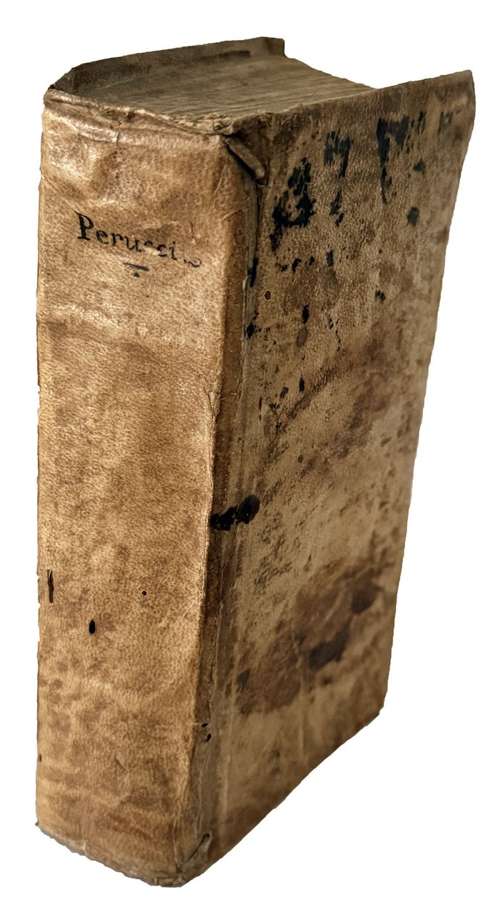 12mo (143x75 mm). [12], 394, [2] pp. Collation: a6 A-Q12 Q[i.e.R]6. To a few surviving copies of this rare book was added an engraved frontispiece, which is not present in this copy. Contemporary stiff vellum, inked title on spine (slightly stained and soiled). On the title page ownership entry “Joannis Antonij Donelli”. Tear repaired to l. B8, worm tracks skillfully repaired on several leaves occasionally affecting the text, light browning, but a good, genuine copy.