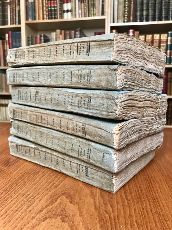 6 in-8° (cm. 22), brossure editoriali a stampa, carte in barbe e in buono stato, con 11 tavole illustrative e di tabelle ripiegate f.t. (fra cui una veduta delle piramidi e una fase della loro costruzione); poche sporadiche e leggere fioriture. Traduzione di un'opera assai interessante e di gusto enciclopedico del giurista francese (Parigi 1758), resoconto delle conoscenze degli antichi popoli (Assiri, Babilonesi, Egiziani, Ebrei, Greci, Fenici) dal diluvio universale fino al ritorno del popolo ebraico dall'Egitto. La prima edizione italiana fu stampata da Vincenzo Giuntini a Lucca nel 1761. Riporta ezioni sulle bevande, l'arte di fare l'olio, di coltivare i giardini, la panificazione, la sartoria, la tintura, il commercio, la navigazione, eccetera. Buon esemplare genuino. (NQ2)
