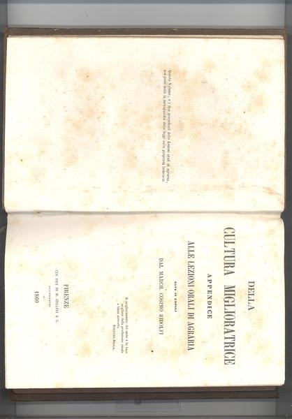 IN 8°, pp.364, LEGATURA D'EPOCA CARTONATA RIGIDA MARRONE, TITOLO IN ORO AL DORSO.<BR>NATE COME COMPLEMENTO ALLE LEZIONI ORALI D'AGRARIA PUBBLICATE A FIRENZE NEL 1857, LE PRESENTI MEMORIE SI PROPONGONO DI GUIDARE I LAVORATORI DELLE CAMPAGNE SEGUENDO I DETTAMI DELL'AGRICOLTURA RIFLESSO DELLA SCIENZA AGRARIA. IL RIFERIMENTO, SONO LE LEZIONI DEL FRANCESE LECOUTEUX CHE IL RIDOLFI, NELLE SUE LEZIONI A EMPOLI TRA IL 1857 E IL 1858 CITAVA E DI CUI AVEVA RACCOMANDATO AI COLTIVATORI LA LETTURA NELLE PAGINE DEL GIORNALE AGRARIO TOSCANO. VECCHIO<BR>TIMBRO ALLA PRIMA CARTA BIANCA, OTTIMA CONSERVAZIONE DI QUESTA RARA OPERA.