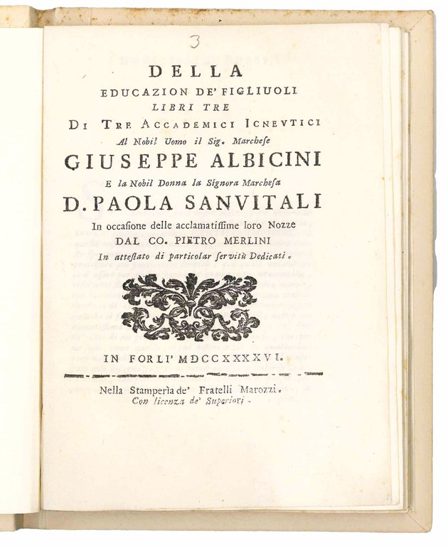 In ottavo (160x115 mm). Pagine 54. Cartonato moderno. Curiosa operetta incentrata sul modo d'educare i fanciulli, composta in occasione del matrimonio dei forlivensi Giuseppe Albicini e Paola Sanvitali.