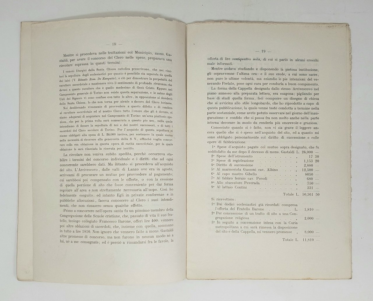 >In-8, pp. 29 con bella illustrazione a piena pagina della cappella ecclesiastica all'inizio dell'opera. Brochure editoriale a stampa (. Pubblicazione offerta agli Ecclesiastici Torinesi e agli associati all'opera "La Chiesa in Piemonte". Edizione originale. Ottimo stato.