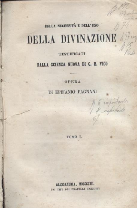 2 voll. in un tomo in-8° (215x140mm), pp. 327, VII; 300, IV; legatura di inizio '900 m. tela nera. Ripiegata f.t., una tavola cronologica delle mitologie primitive. Sparse notazioni e sottolineature a matita. Buon esemplare. Prima edizione. Ripercorrendo le orme della 'Scienza Nuova' vichiana l'autore (Mortara, 1793-Torino, 1868) si propone di dimostrare 'che senza qualcuna scienza della divinazione od arte di avere avvisi dal vedere le cose sotto aspetto di cause, sarebbe impossibile l'esistenza intellettuale dell'uomo' e, al contempo, di dare 'una genuina e più chiara esposizione' del capolavoro del filosofo napoletano. Scrivono Benedetto Croce e Fausto Nicolini a proposito di questo volume: '.Studioso condotto al vichismo dalla venerazione pel Foscolo. Egli ebbe come due idee fisse. L'una, che la filosofia si debba fondare sui fatti, nel senso che per ciascuna idea vada ricercato il fatto umano correlativo. L'altra, ce la vita umana non sarebbe possibile senza la divinazione, la quale ci consente di ravvisare la causa o forza immanente che sta sotto i fatti sensibili e li produce. Con queste due idee fisse. si diè a meditare la Scienza Nuova. E poiché. trovò svolti in essa questi due concetti - che la sapienza cominciò, presso i popoli primitivi, da una rozza divinazione, e che dai pagani 'la provvedenza fu appellata 'divinità' da divinari, 'indovinare' - credé di poter ravvisare nel Nostro il suo duca, signore e maestrro. Per purgare la Scienza nuova dalle sue oscurità e renderla accessibile a ogni sorta di lettori, si dà a riscriverla dalla prima all'ulima parola. e a canone d'interpretazione assurgono le idee singolari del rifacitore [e] il risultato è che l'opera, senza acquistare punto in chiarezza, presenta molte volte un pensiero affatto diverso da quello del Nostro'. Il Fagnani fu anche uomo politico, sociologo, ingegnere, ispettore delle Regie Finanze, alto funzionario del Regno di Sardegna e amico di Cavour. Croce / Nicolini, II, pp. 607-608.