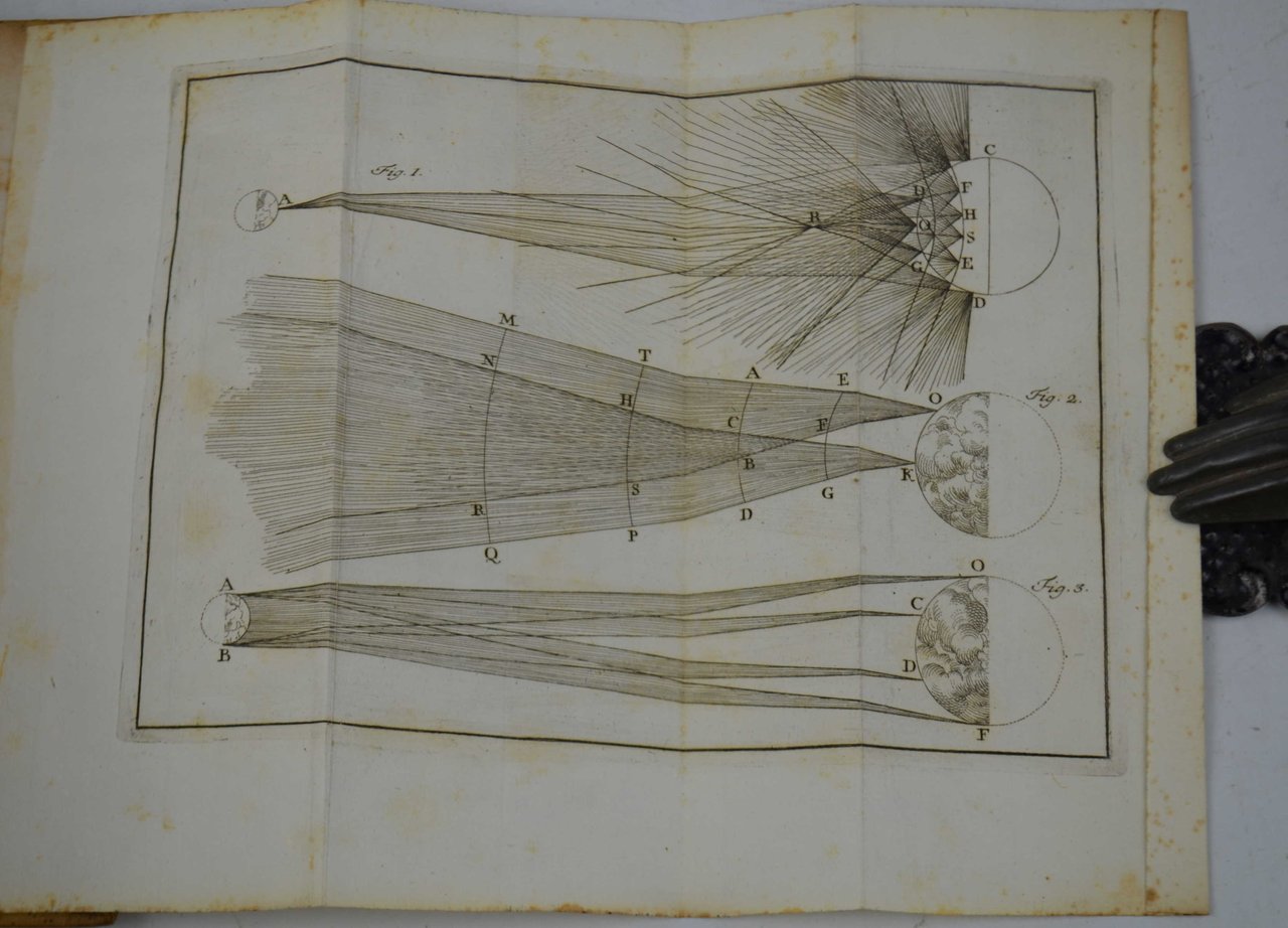 Cm. 20, pp. (4) 127 (1). Con due tavole incise in rame che raccolgono 7 figure relative agli effetti visivi dei raggi. Leg. coeva in piena pergamena rigida con titoli in oro al dorso. Qualche fioritura, perlopiù marginale, peraltro esemplare genuino e ben conservato. Edizione originale, non comune.