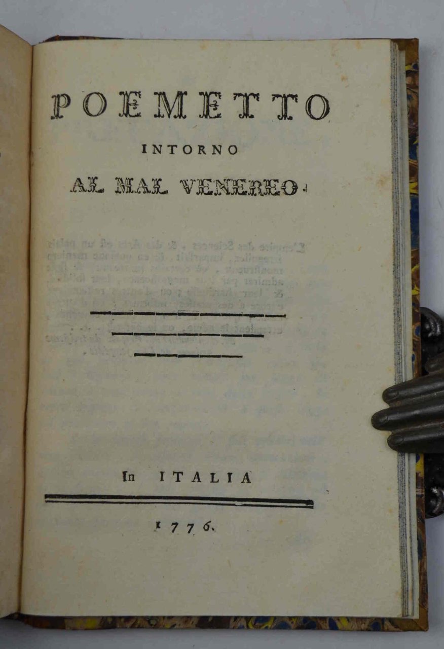 Cm. 18, pp. xx, 171 (1). Bell'antiporta figurata ed incisione al centro del frontespizio. Unito a: (BERTOLA A.) Poemetto intorno al mal venereo. In Italia, 1776. Pp. xxx. Solida legatura del tempo in mezza pelle, dorso liscio con fregi in oro e titoli su tassello in marocchino rosso. Esemplare genuino e ben conservato. Il secondo testo è la rara edizione originale (ed unica) di questo poemetto attribuito talvolta al Casti, ma ora verosimilmente a Francesco Bertola, scrittore calabrese da non confondere con l'omonimo riminese vissuto nello stesso periodo.