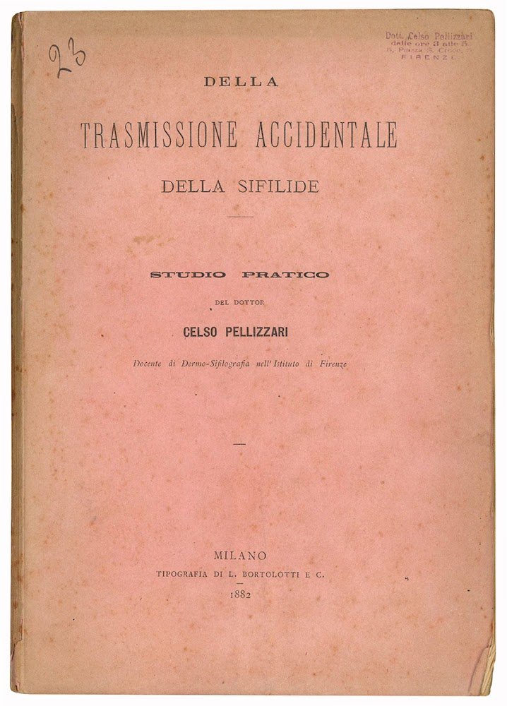 Mm. 133x159. Pp. 94. Carta leggermente ed uniformemente brunita, lievi aloni e leggere fioriture ad alcune carte. Brossura editoriale con titolo alla copertina anteriore. Copertine un po' sbiadite e minime mancanze al dorso. Estratto da "Giornale delle malattie veneree e della pelle", fasc. IV, V e VI (agosto, ottobre - dicembre 1882).