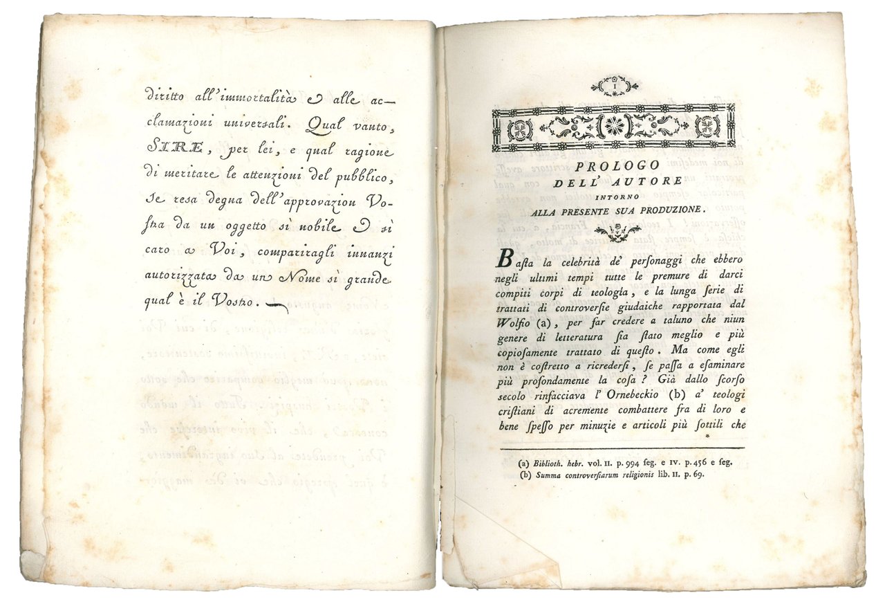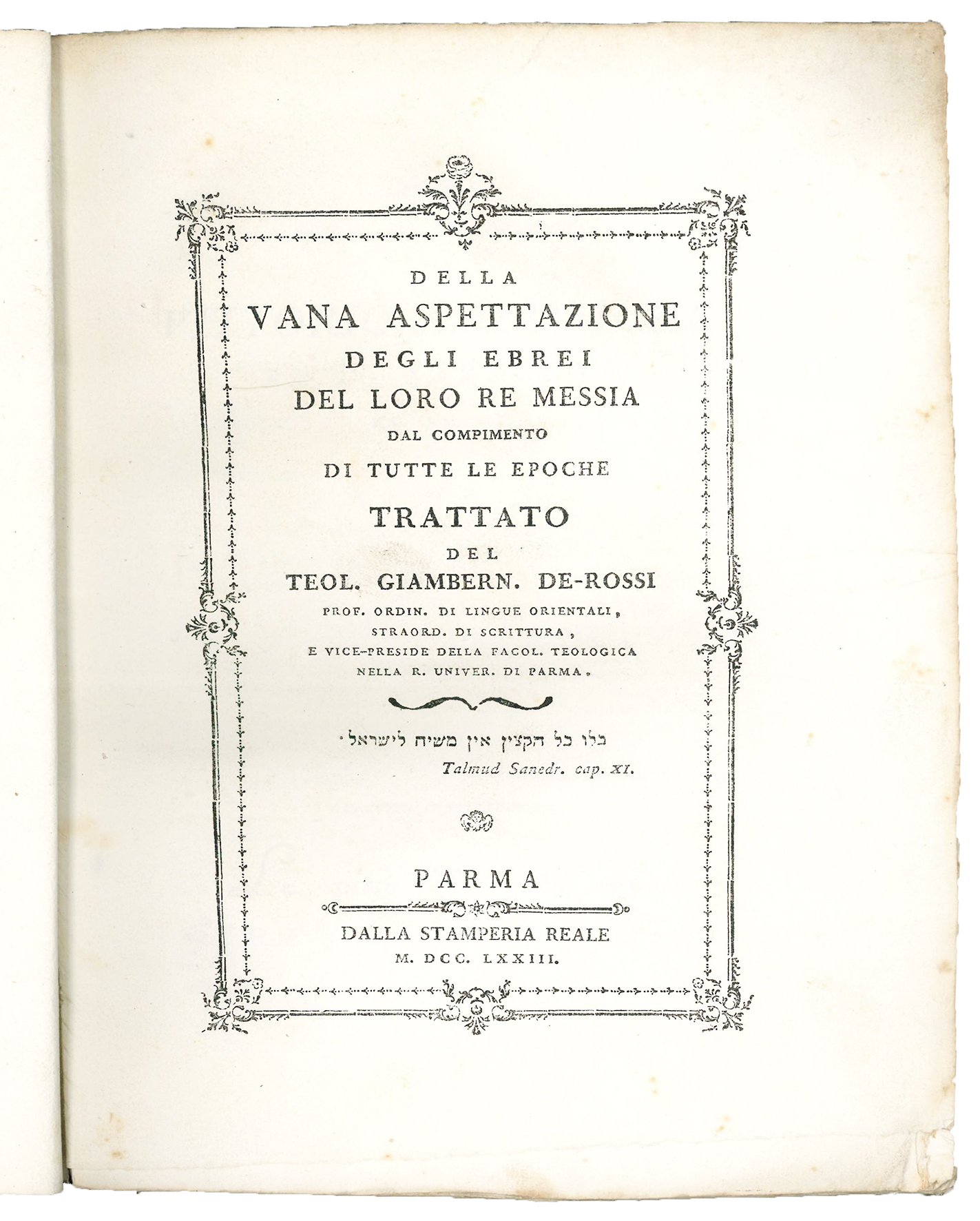 First edition (small 4to issue) dedicated to Vittorio Amedeo III, King of Sardinia. Reprinted in Rome in 1840, the ‘Of the vain expectation of the Jews for their Messiah King' includes numerous previously unpublished texts and it is particularly important for its lucid expression in the prologue of the inadequacy of Christian scholarship on Jewish subjects mostly due to a general lack of knowledge of Hebrew language and understanding of Jewish biblical commentary. Because of its polemical nature, the work was violently attacked by two Dominicans, G. Masi and L. Ceruti, in an anonymous work published in Venice the following year: Riflessioni teologico-critiche contro il libro del teologo Giambernardo De Rossi Della vana aspettazione (‘Theological-critical reflections against the book by the theologian Giambernardo De Rossi Of the vain expectation'). De Rossi responded with the Esame delle riflessioni teologico-critiche contro il libro Della vana aspettazione (‘Examination of Theological-Critical Reflections Against the Book Of the vain expectation', Parma, 1775).