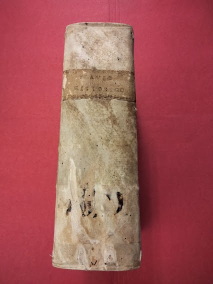 In 8°, m. perg. no coeva, cc. nn. 11 + pp. 366 + 296 ( i primi 20 libri) + cc.nn. 177 (ultimi 7 libri). Numerose inc. nel t. alcune delle quali a tutta p. I primi 10 libri sono editi nel 1616, i secondi dieci nel 1614 e gli ultimi 7 nel 1604. Tracce marginali di bruciature che ledono il t. su 7 cc. nn. + dalla c. n. 166 alla 168. Tracce di gore. Rifilato.Forellini principalmente marg. che solo raramente ledono pochissime lettere. T.A.