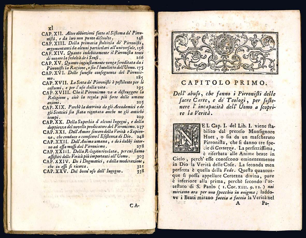 Edizione originale. "Muratori combatté da un punto di vista morale il pirronismo... Confutò l'esasperato pirronismo non soltanto di Pierre Bayle e John Toland, ma del vescovo Pierre-Daniel Huet. Negare la conoscenza sperimentale avrebbe potuto condurre a negare l'esistenza di Dio, che poggiava anche su prove a posteriori. La logica di Port Royal aveva mostrato che la ragione non era in contrasto con la fede" (Dizionario Biografico degli Italiani, LXXVII, 2012, G. Imbruglia).