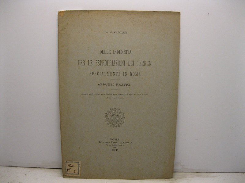 Delle indennita' per le espropriazioni dei terreni specialmente in Roma. Appunti pratici. Estratto dagli Annali della Societa' degli Ingegneri e degli Architetti Italiani, anno IV, fasc. III