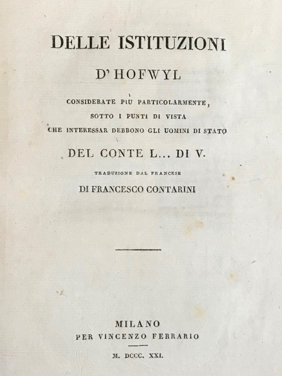 Delle istituzioni d'Hofwyl considerate più particolarmente sotto i punti di vista che interessar debbono gli uomini di Stato del conte L. di V. Traduzione dal Francese di Francesco Contarini.