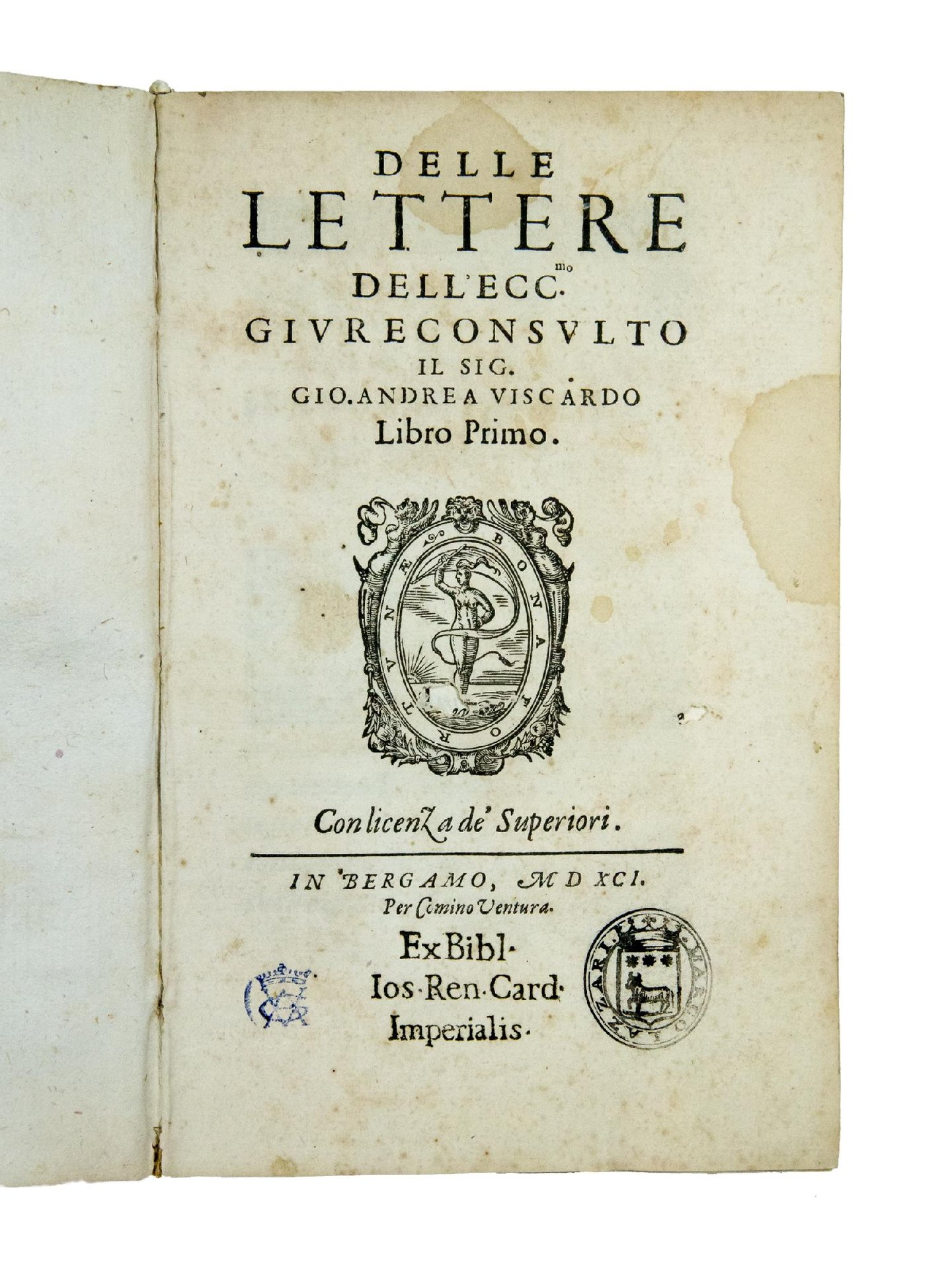 FIRST AND ONLY EDITION, dedicated to cardinal Francesco Morosini, bishop of Brescia (Bergamo, May 15, 1591), of this collection of 209 letters. For unknown (but probably editorial) reasons, the letters are all undated. Only the 18 letters addressed to the author are dated between 1555 and 1589. Furthermore, 27 letters present no recipient and are probably fictitious.