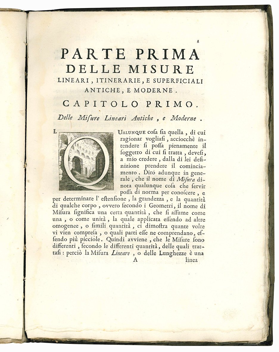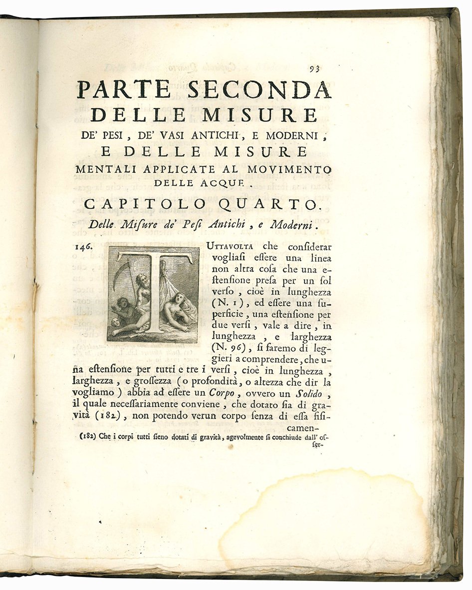 Prima edizione di questo importante trattato dedicato al governo veneto, che valse all'autore la nomina a “Ingegnere della Serenessima”. L'opera «è organizzata in sei capitoli che trattano delle misure “lineari”, “itinerarie” (per grandi distanze), “superficiali”, “de' pesi”, “de' vasi” (cioè di capacità) e “mentali”. Con quest'ultima insolita denominazione, di per sé significativa della consapevolezza filosofica che nel Cristinani è lo sfondo dell'uso applicativo di certe nozioni, egli indica misure che, come quelle di velocità o portata d'un corso d'acqua, non si riferiscono ad oggetti fisici statici, ma ad astrazioni relative a fenomeni dinamici. Mentre i primi cinque capitoli presentano e confrontano, con un ampio corredo di note, varie unità di misura di età trascorse o proprie dell'epoca (rapportate tutte ad una lineare, il braccio parigino), l'ultimo è quasi una sintesi dell'idrodinamica allora nota, ed è in parte originale perché organizza deduttivamente la materia, presentando in modo sistemativo risultati e nozioni ottenuti separatamente da ricercatori che vanno da Galileo a Poleni» (D.B.I., XXXI, p. 18, voce di U. Baldini).