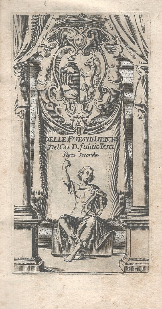 Bologna, Carlo Zenero, 1645, in-12, cartone rustico coevo, titolo manoscritto al dorso, pp. 162, (2). Bella antiporta calcografica inc. da F. Curti (figura maschile con lira che indica sovrastante blasone Campeggi all'interno di cornice architettonica formata da colonne e drappi) e marca al frontespizio con allegoria di Bologna (donna con cornucopia e vessillo). Eleganti fregi e capilettera. Fori di tarlo al piatto post. Volume facente parte delle "Opere del Sig. Fulvio Testi con nova aggiunta all'Ill. Sig. Federico Mirogli" (voll. 2: 1644-45), ma completo a sé stante in quanto dedicato alle rime del Testi, che fu al servizio del Duca d'Este e ricoprì vari incarichi fra cui quello di Governatore della Garfagnana.