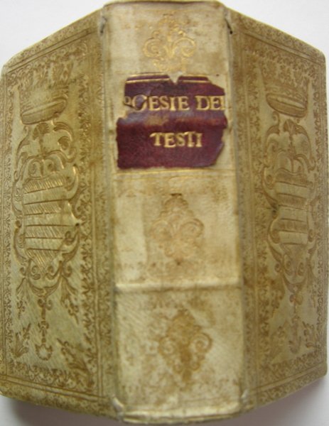 Venetia, MDCLXVI (1666). Fort volume in-16 (13 x 7 cm) reliure plein velin avec une riche décoration dorée, fleurons dorés sur le dos avec pièce de titre bordeaux, 646 p. Texte en italien. Ex-libris armorié en page de garde et tampon en page de faux-titre. Excellent état malgré quelques erreurs de pagination comme souvent. Fulvio Testi (1593 - 1646 ) était un diplomate et poète italien . Classé comme l'un des principaux représentants de la littérature baroque du XVIIe siècle , était au service du duc d'Este à Modène, a également occupé le poste de gouverneur de la Garfagnana . Sa production poétique aborde les questions des civils et des tons solennels, favorables à la Savoie . Accusé de trahison, pour avoir tenté d'établir des relations avec la cour de France , il fut envoyé en prison, où il mourut peu de temps après. Ses "Poésies lyriques" furent publiées la première fois en 1637.