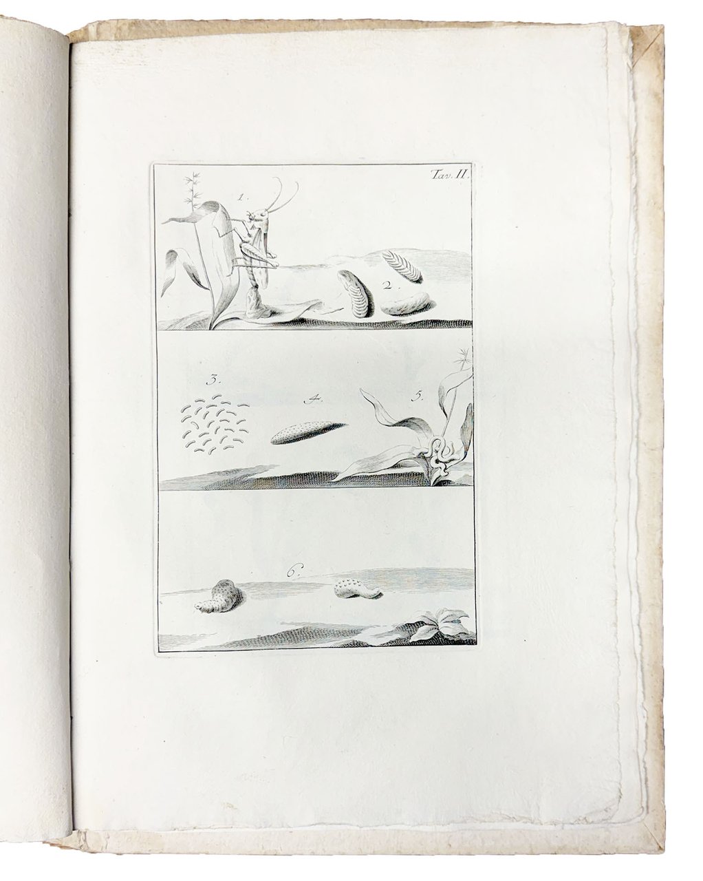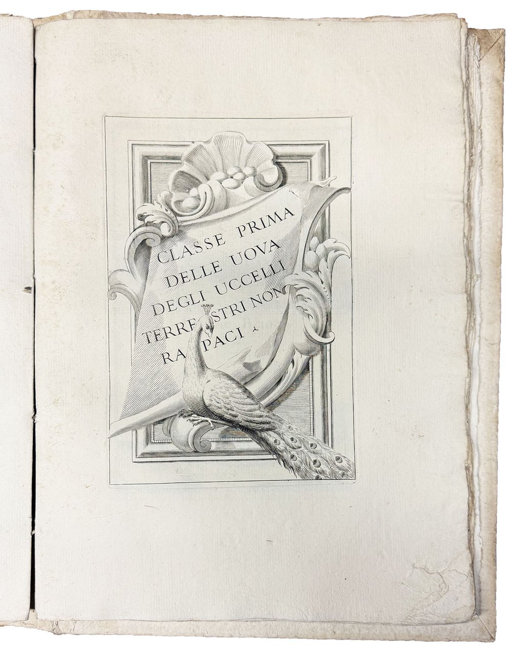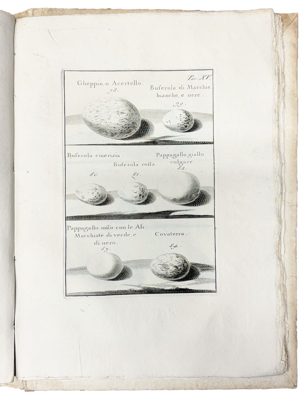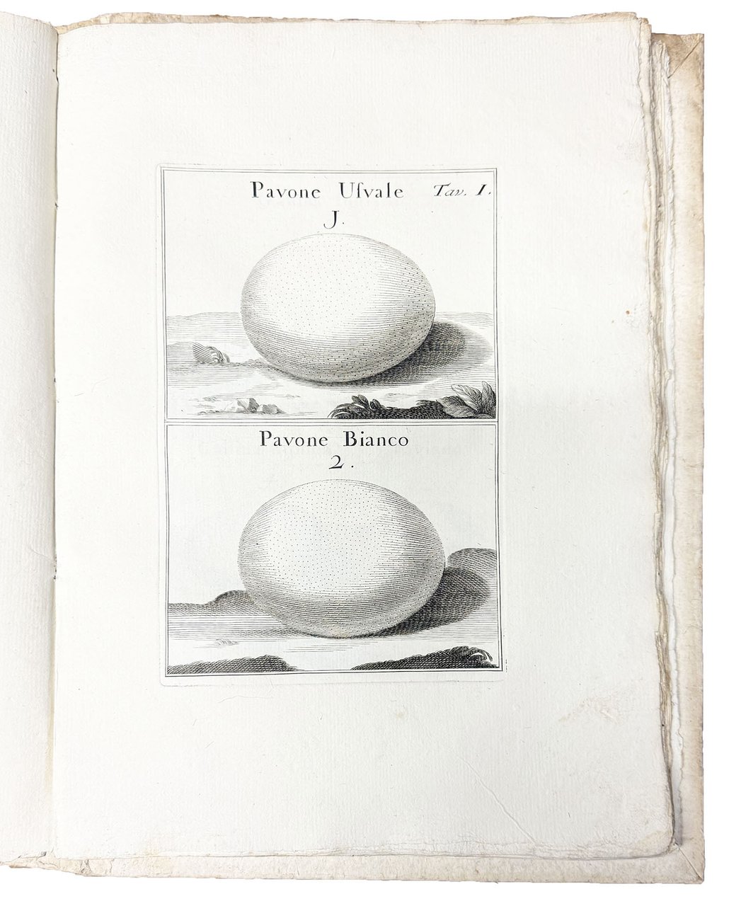 In folio (mm. 290x208). Pp. [10, inclusi l'antiporta incisa e il frontespizio], 130, [2], 55, [3] e [1: Classe prima delle uova degli uccelli terrestri non rapaci], XIII, [1: Classe seconda delle uova degli uccelli terrestri rapaci], XIV-XVI, [1: Classe terza delle uova degli uccelli aquatici], XVII-XXII, [1 bianca], VIII carte di tavole calcografiche. Segnatura: [A]4 B-Bb4. La carta Bb4 è bianca. Iniziali, testatine e finalini in legno. La Dissertazione delle cavallette comincia con frontespizio proprio alla c. Z1r. Cartonato coevo con nervi passanti e titolo manoscritto al dorso. Sul riguardo libero anteriore ex-libris della collezione gastronomica di Jacques e Hélène Bon. Volume un po' sciolto, ma bellissima copia come nuova, intonsa ed in gran parte ancora a fogli chiusi.