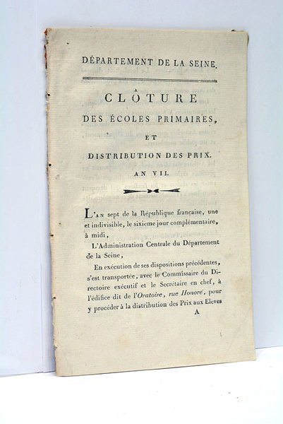 28 pages. (20 x 12 Cm). Broché. Très rare document publié par l'administration du Département de la Seine pour la remise des prix de fin d'année scolaire, avec notamment les discours prononcés pour l'occasion par son président le banquier et homme politique Jean-Barthélemy Le Couteulx de Canteleu (1749-1818), et par le géographe et pédagogue Edme Mentelle (1730-1816). En fin d'ouvrage, le nom des élèves primés est listé dans deux tableaux, dont l'un fait état des distinctions accordées "aux jeunes citoyennes".