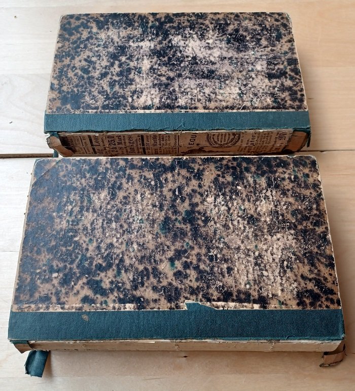 • Rücken beider Bände fehlt, durchgehend leichtgewellt und braunfleckig, vereinzelt Bleistiftanstreichungen, Buchblock stabil, private Widmung jeweils auf Vorsatz vorn, sonst noch gut erhalten.