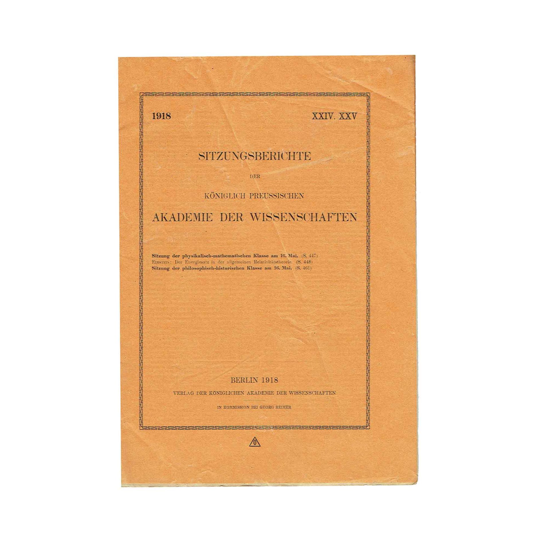 First separate printing in the original printed wrappers, of Einstein's paper about the energy of a gravitational field. - Edition: The Academy's publishing list on the rear cover also announces an offprint of this paper for Reichsmark 0,50. - Condition: Some pages crease due to handling and reading, otherwise fine copy. - Rarity: ABPC (1973ff.) and APO (1988ff.) records only 1 copy of this edition at auction (2011). – Reference: Boni-Russ-L. 109; Collected Papers, vol. 7, 9; Schilpp-Shields 121; Weil 99.