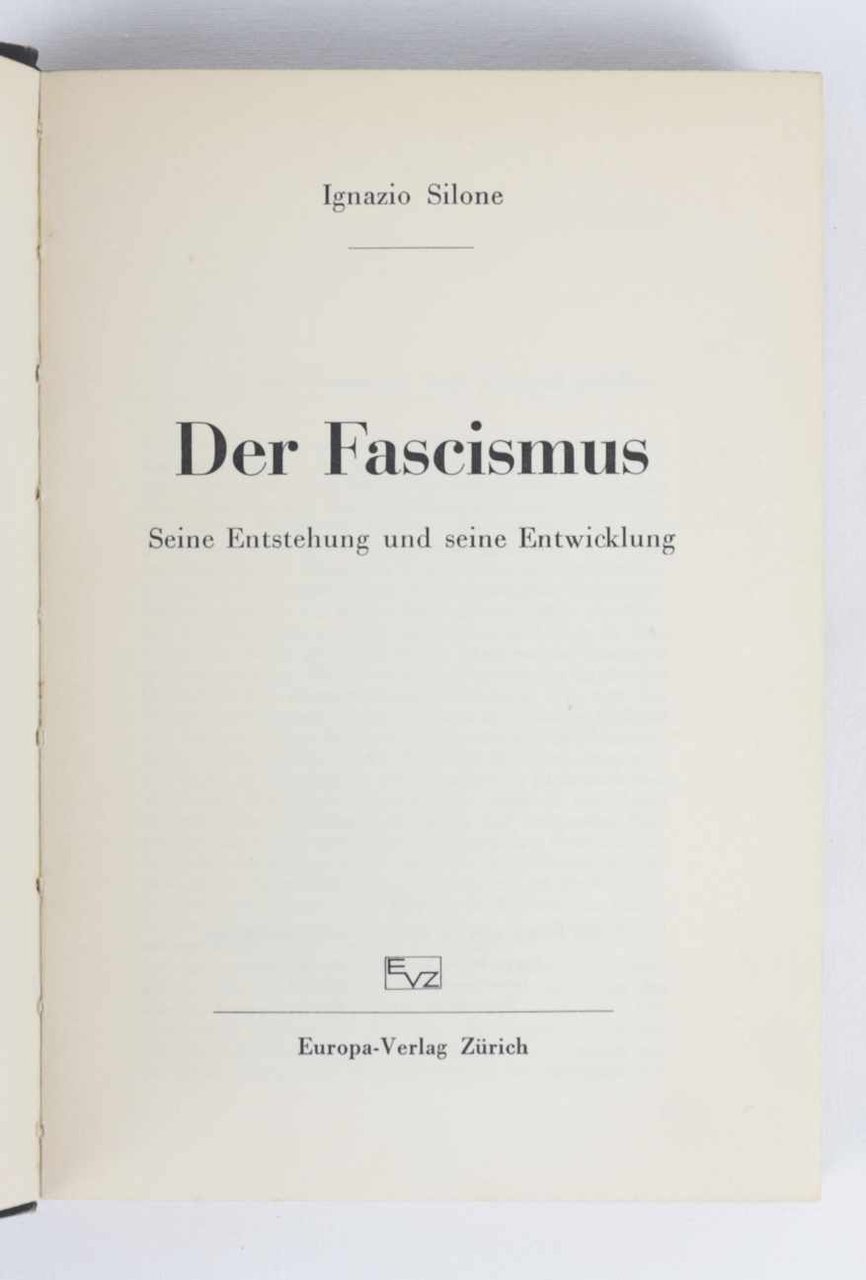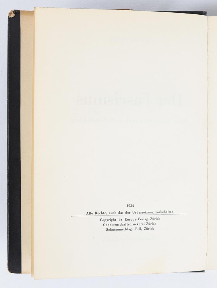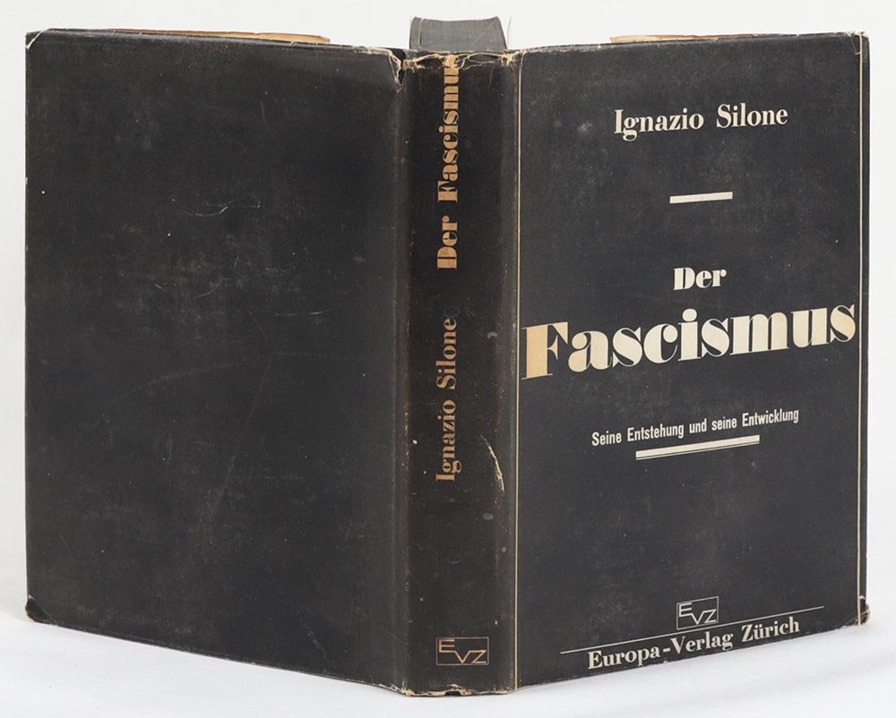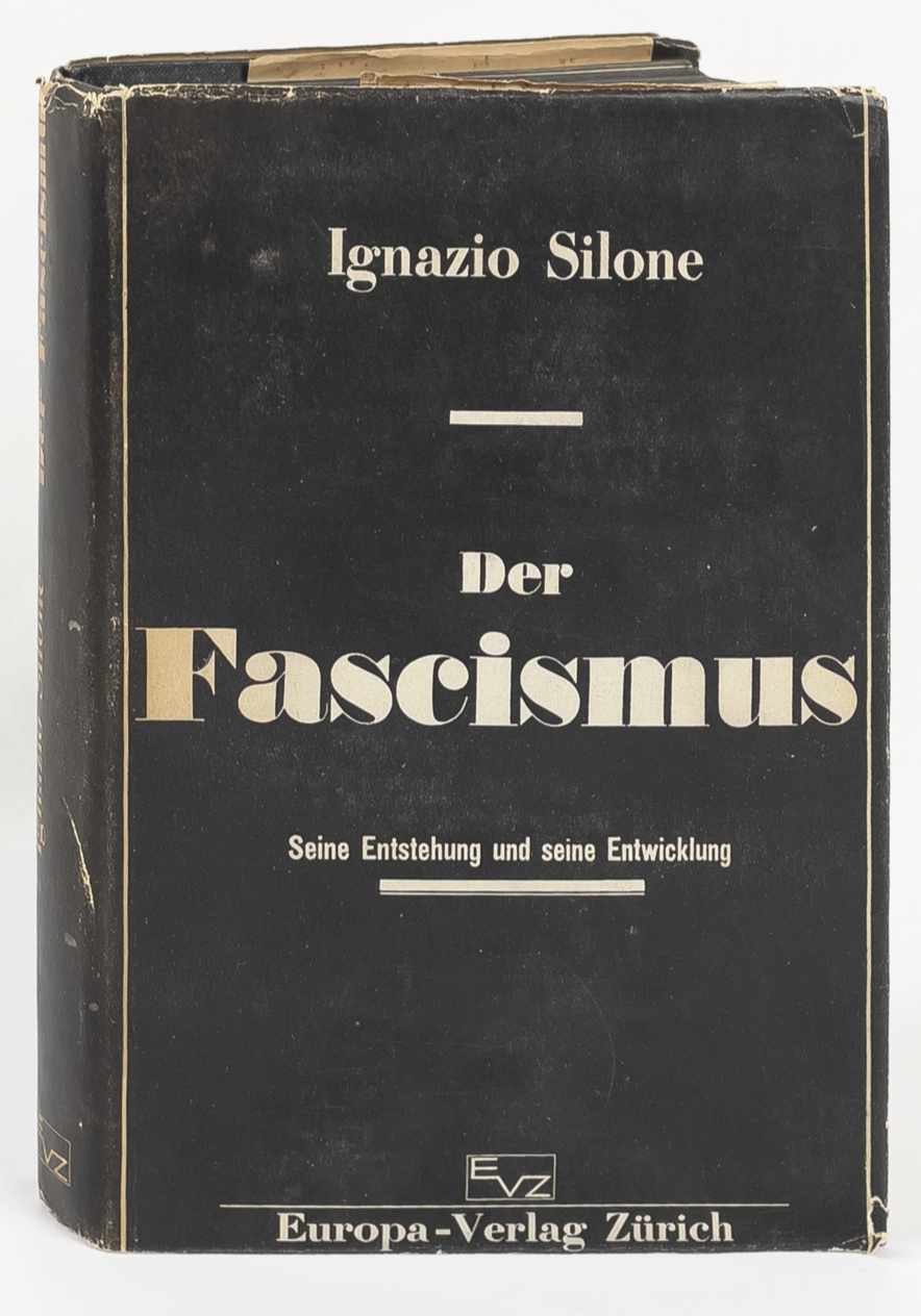 LIBROEdizione originale.Ottimo esemplare, fresco e pulito, nell’emissione con copertina rigida (hardcover) completa della rarissima sovracoperta disegnata da Max Bill, molto ben conservata (minimi segni del tempo perimetrali; dorso brunito).Secondo libro pubblicato da Silone, nella traduzione non accreditata ma di Gritta Baerlocher. Grazie alle notizie che si leggono nel «Meridiano» curato da Falcetto, si apprende che il nucleo dell’opera era già pronto nell’estate del 1930, «scritto per i tedeschi e per una casa editrice di agitazione antifascista, com’è il Mopr-Verlag [.]» (p. 1541). Tra fine 1930 e maggio 1931 si profilò una più che concreta possibilità di pubblicarne una versione francese, modificata e arricchita, con le Éditions du Carrefour di Paul Nizam. Né l’edizione con la berlinese Mopr né quella con i parigini di Carrefour, sebbene entrambe in uno stadio già avanzato, ebbero poi seguito. Un anno dopo, fra il maggio e il giugno 1932, estratti del libro, con modifiche e aggiunte minori, apparvero come articoli autonomi sul mensile «Information», pubblicato proprio da Emil Oprecht, l’editore di «Fontamara» e il proprietario dell’Europa Verlag, sigla editoriale esplicitamente creata nel 1933 per la saggistica antifascista. Europa Verlag finalmente darà alle stampe il libro nel dicembre 1933 (ma con data 1934), facendolo annunciare da due anteprime pubblicate su «Die neue Weltbühne», periodico indipendente di orientamento socialista fondato e diretto da Willi Schlamm: il 14 settembre (II,37) e il 7 dicembre (II,59). Grafica editoriale e disegno della sovracoperta sono di Max Bill, come nel caso di «Fontamara»: qui però il maestro sceglie volutamente uno stile più classico a impaginazione centrata, dominato dal nero sia sulla tela che sulla sovracoperta, rivestendo il libro dello stesso colore e stile del soggetto trattato. -- Silone non ritenne che fosse utile dare di quest’opera una versione italiana (è stato pubblicato solo nel 1992 da SugarCo, quindi nel 2002 da Mondadori, ma sempre in traduzione italiana dal tedesco), essendo nel frattempo tornato sull’argomento con un taglio più letterario in «La scuola dei dittatori» (1938): «A parer nostro [.] l’interesse del saggio non si riduce a questo. Lo scrittore vi ha applicato e portato alle ultime conseguenze la tecnica dei reperti di partito, fino a toccarne i limiti. In tal senso il libro esaspera e conchiude un’esperienza espressiva di Silone saggista e polemista, cioè quella partitica, e ne apre un’altra: la metodologia è ancora marxista, ma l’informa una necessità d’approfondimento già sganciata da schemi pregiudiziali. È un lavoro di indagine, che precede e prepara la creazione di “La scuola dei dittatori», senza che quest’ultima però gli tolga il suo significato» (D’Eramo, p. 127). Voigt, Silone e la stampa tedesca dell’esilio, p. 132 n. 2 e passim; Falcetto (cur.), Silone: Romanzi e saggi 1927-1944 (I Meridiani), pp. 1541-s; D’Eramo, Ignazio Silone (Roma 2014), pp. 127-131
