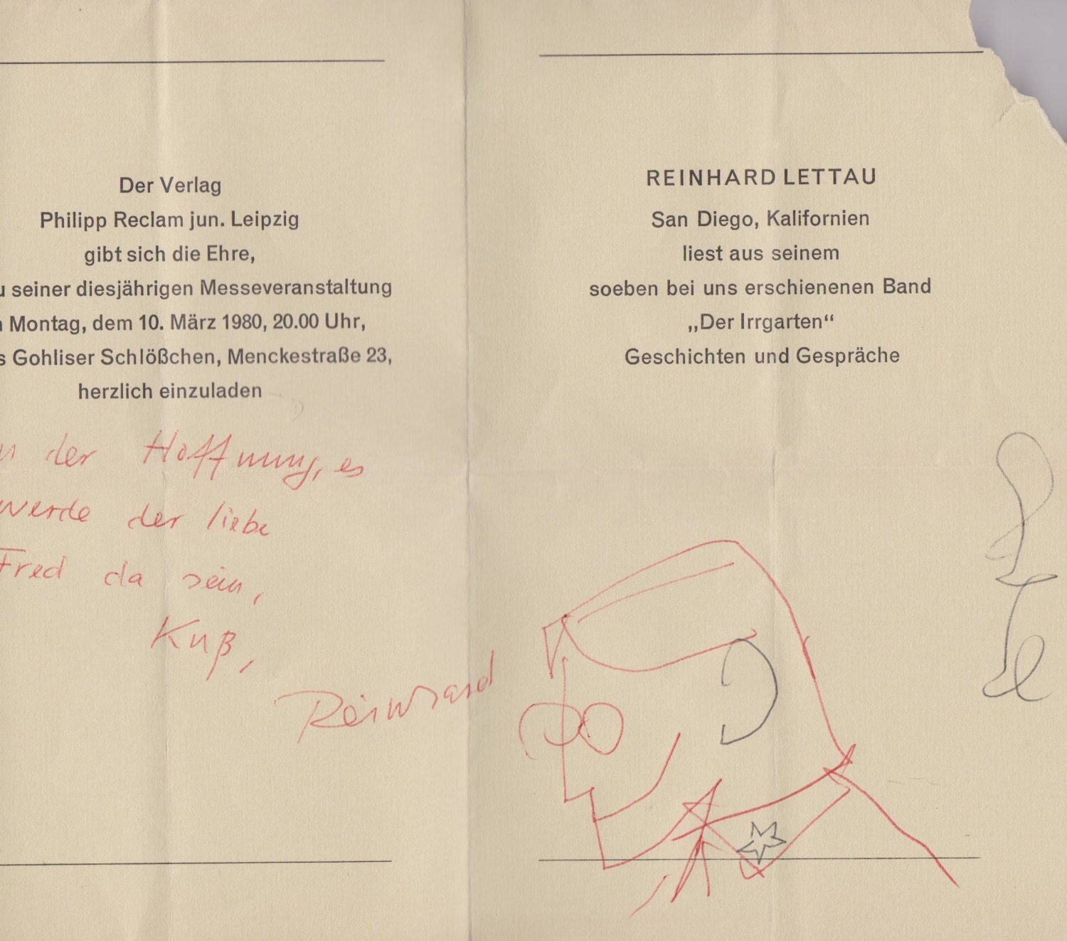 Mit Widmung des Autors auf Titelblatt. Mit gefalteter Einladung (21 x 13,5 cm) zu einer Lesung des Autors als Beilage. Diese ist innen mit der Widmung "in der Hoffnung, es werde der liebe Fred da sein, Kuß, Reinhard" und einer kleinen Skizze versehen. Miit Fehlstelle an oberer Ecke (ca. 4 x 3 cm.)