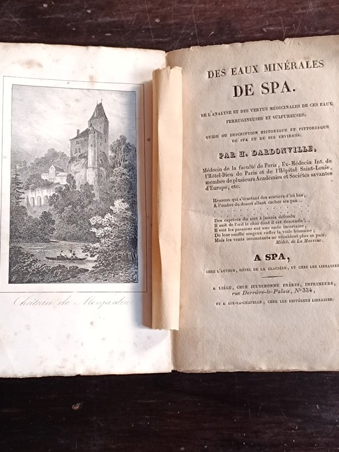 In-12° (cm. 18,4), brossura editoriale a stampa azzurra con titoli in nero al dorso e ai piatti inquadrati inquadrati da cornici (alcune tracce d'uso); pp. [4] XII [4] 192 in barbe, in stato molto buono (lievi fioriture sparse, leggere gore marginali a poche carte, tassello di collocazione applicato al contropiatto); con 4 graziose tavole di vedute incise in litografia fuori testo, protette da velina, di cui una all'antiporta. Guida che tratta delle virtù e proprietà delle acque, ma anche della storia di Spa e dei suoi dintorni. Volume parzialmente intonso. Buon esemplare. (NO8)