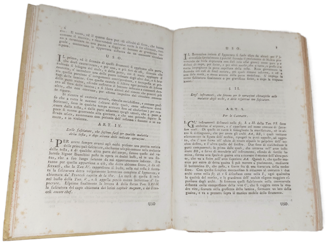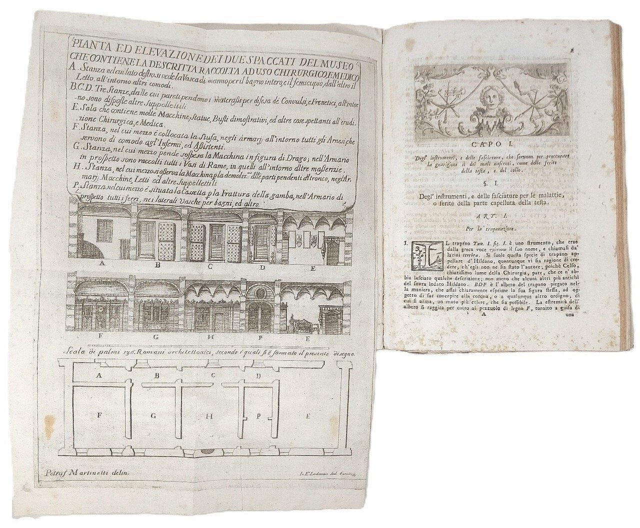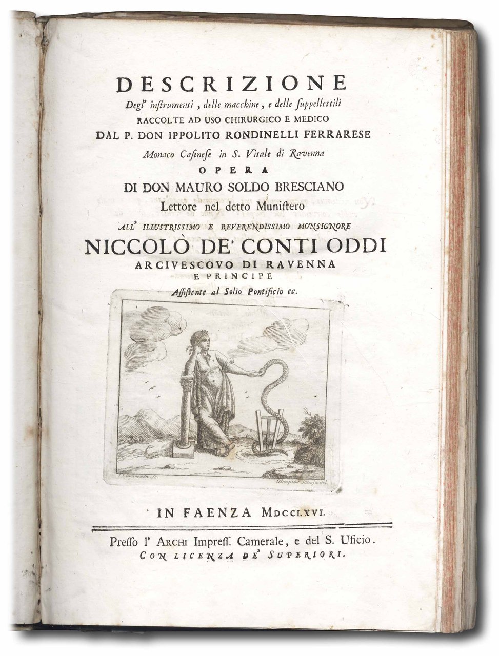 >in-4 (280x190 mm), pp. XX, 119 (invertite in fase di rilegatura le pp. 69-72), (1), legatura coeva in pergamena, titolo in oro tassello al dorso. Vignetta al titolo, testatine, finalini ed iniziali vegetali; completo di una tavola con l'originaria disposizione del Museo all'interno del Monastero di San Vitale e di LXXII tavole f.t., ripiegate in modo da favorirne la consultazione, raffiguranti il più ricco repertorio iconografico italiano di ferri chirurgici e apparecchiature meccaniche terapeutiche dl XVIII secolo (ferri, letti, tavole operatorie, poltrone, mobili, sistemi per il trasporto dei pazienti, fasciature...), la maggior parte sono firmate da Giovanni Lindemain. Prima ed unica edizione di quella che è l'unica testimonianza sopravvissuta di questa grandiosa istituzione museale medico-chirurgica che nacque nel 1746 a Ravenna sotto l'influsso delle nuove idee Settecentesche. La trasformazione della raccolta in Museo, con vere e proprie finalità collezionistiche e acquisto anche di materiale didattico illustrativo fu dovuta al dotto padre Ippolito Rondinelli; nella realizzazione di questa impresa si associò con il chirurgo locale Gaetano Bianchi. L'importanza che ebbe fin dall'inizio la collezione è testimoniata anche dalla collocazione dei materiali all'interno del complesso benedettino. Sebbene fosse uno dei maggior vanti della comunità, a partire dal 1797, a seguito delle soppressioni napoleoniche, la raccolta seguì un triste destino di dispersione. Nel 1862 si ha ancora traccia di qualche strumento, del quale venne effettuato il restauro. Il venire meno della funzione pratica del materiale ne segnò la fine. Buon esemplare, con alcune fioriture, di edizione estremamente rara e curiosa, proveniente dalla collezione di Piergiorgio Borio Medico (ex-libris al contropiatto). Waller 8159. NUC ricorda solo l'esemplare di Yale Medical.