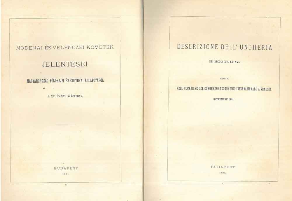 Descrizione dell'Ungheria nei secoli XV et XVI edita nell'occasione del congresso geografico internazionale a Venezia settembre 1881